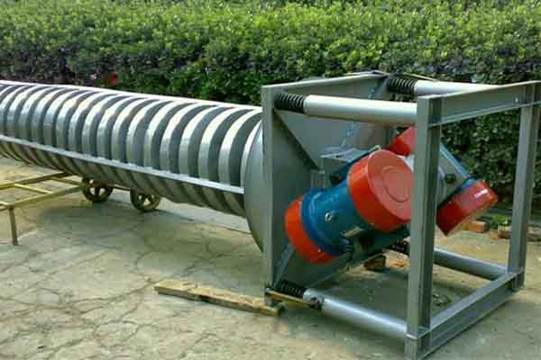 - ZC垂直振動輸送機(jī)的驅(qū)動裝置振動電機(jī)安裝在輸送塔下部,兩臺振動電機(jī)對稱交叉安裝,輸送塔由管體和焊接在管體周圍的螺旋輸送槽組成,輸送塔座于減振裝置上,減振裝置由底座和隔振彈簧組成。